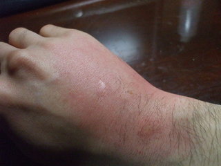 咬傷、掻傷の約30分 – 数時間後に激痛を伴う腫脹と精液様の臭いのする浸出液が排液される。
