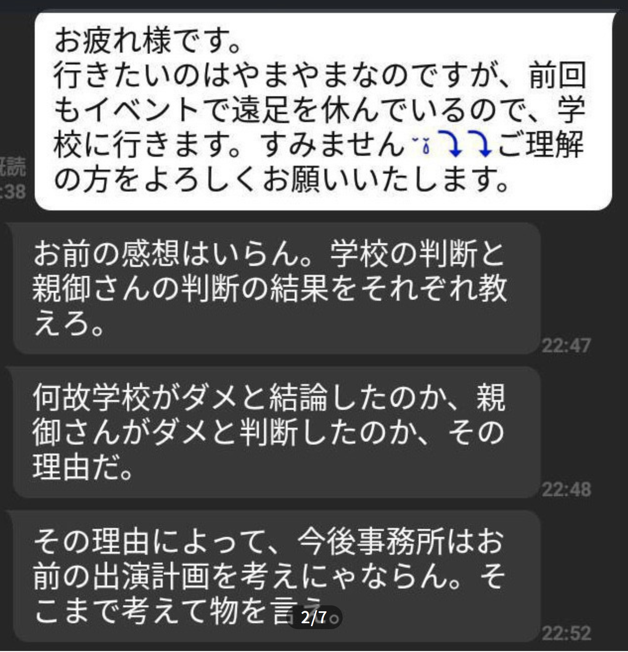 事務所との契約に際しては、「愛の葉Girls」の仕事が学業に支障をきたさないことを前提としていました。しかし実際には、萌景が登校日なので「愛の葉Girls」のイベントを休んで学校に行きたいと、懸命に伝えても聞き入れてもらえず、スタッフの高圧的な態度に萌景も悩んでいたようでした。娘の携帯電話には、学校に行きたいという娘の訴えに対して、事務所スタッフからのこんなメッセージが残っています。