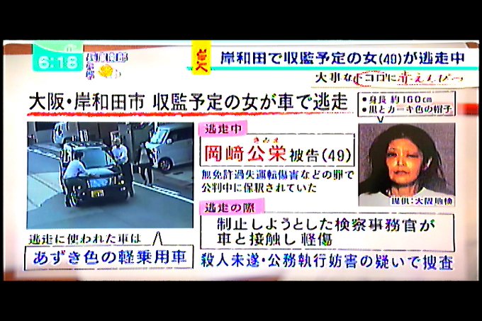 【女の顔写真を公開 大阪地検岸和田支部から収容手続き中の女が車で逃走 岡崎公栄被告】うわあ…ヤク中丸出しの顔…つか、そろそろ法律どうにかしないと、ここ1年でどれだけ逃げられてんのよ。警察官や検察官を責めるつもりはない。法律に難あり。犯罪者に手厚すぎ