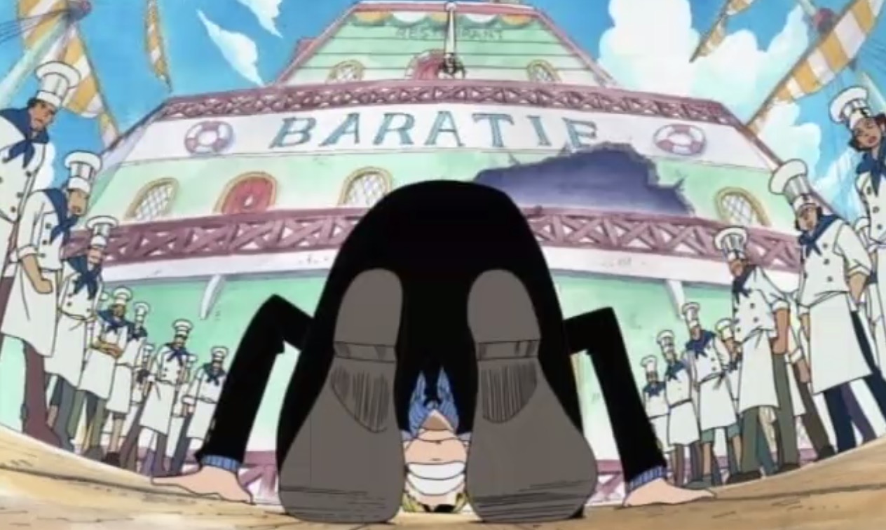ドン・クリーク艦隊はバラティエに侵略を開始し、サンジが華麗な足技で対抗。しかしギンがオーナー・ゼフを人質に取ります。