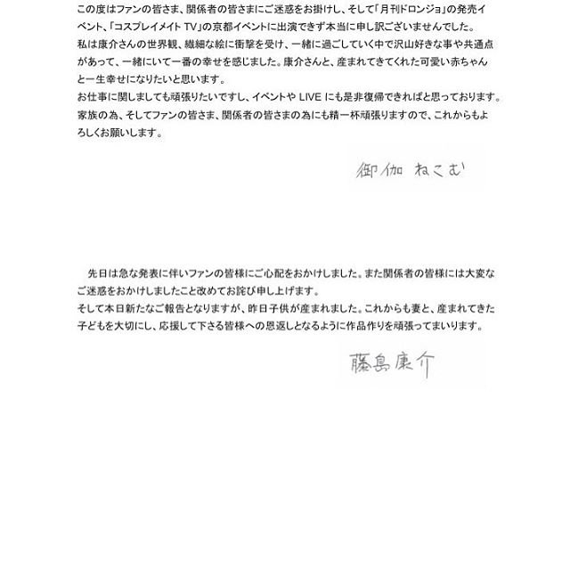 みなさんにご報告があります。この度漫画家・イラストレーターの藤島康介さんと結婚しました。もう1つご報告がありまして、お腹に赤ちゃんがいます。びっくりさせてごめんなさい。大切に育てていきたいと思います。また皆さんの前にママレイヤーとして出れるように頑張りますので待っててください。