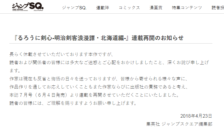 刑事手続きが終了したとのことで、『るろうに剣心-明治剣客浪漫譚・北海道編-』は6月4日発売号から連載が再開されるそうです!