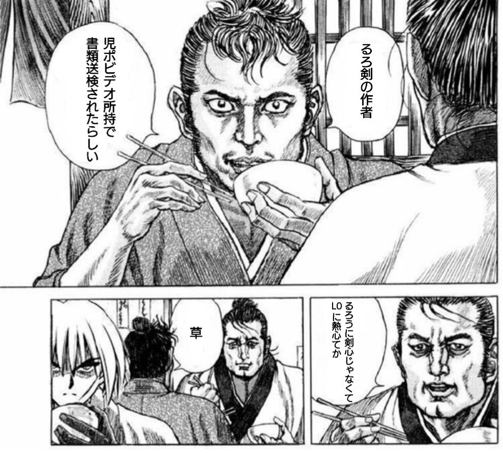 るろうに剣心の作者(和月伸宏)が児ポ所持で書類送検されたニュースが話題になってますので、会社で隣の席の女性の目を気にしながらクソコラを作りました。