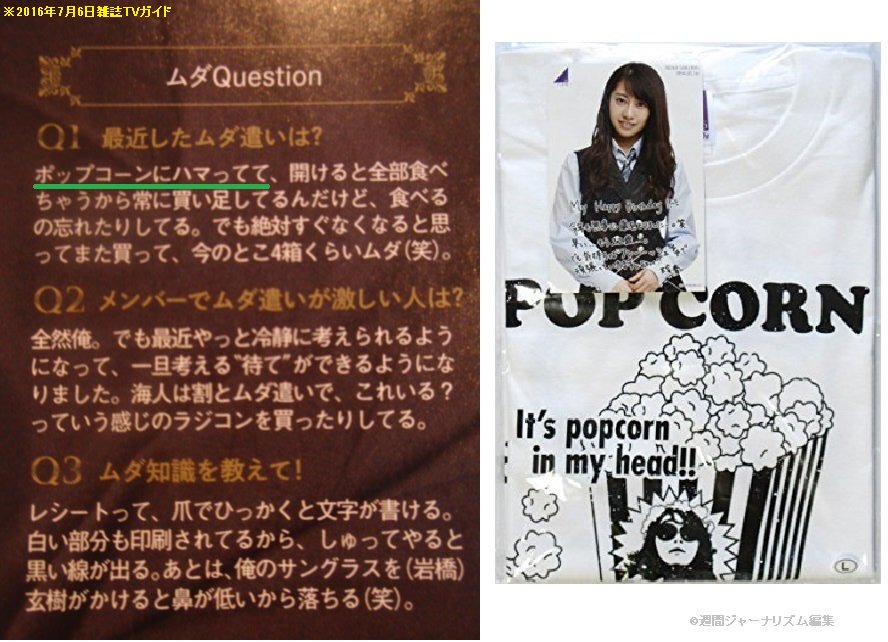 Tシャツにはポップコーンと書かれていて、発売から2ヶ月後に平野紫耀さんがポップコーンにハマっていることを明かし、熱愛を匂わせているという噂に。