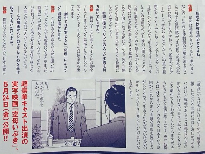 俳優の佐藤浩市さんが内閣総理大臣役で出演した映画「空母いぶき」が5月24日に公開されます。