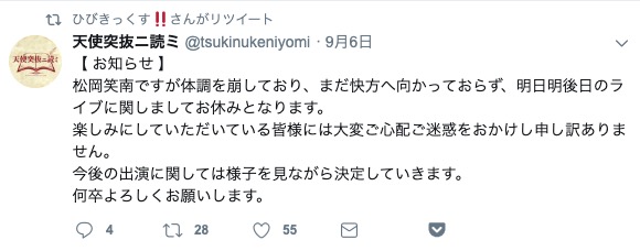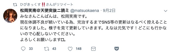 そして、松岡笑南さんが体調不良を理由にSNSの更新をしないという投稿もリツイート。