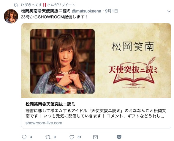 佐藤響は、わいせつ行為をした松岡笑南さんがライブ配信を中止した投稿をリツイート。