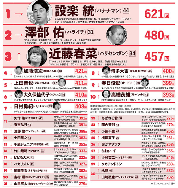 メディアで大活躍中の澤部佑さん。上記の画像は2016年度のテレビ出演本数ですが、堂々の2位にランクインしています。