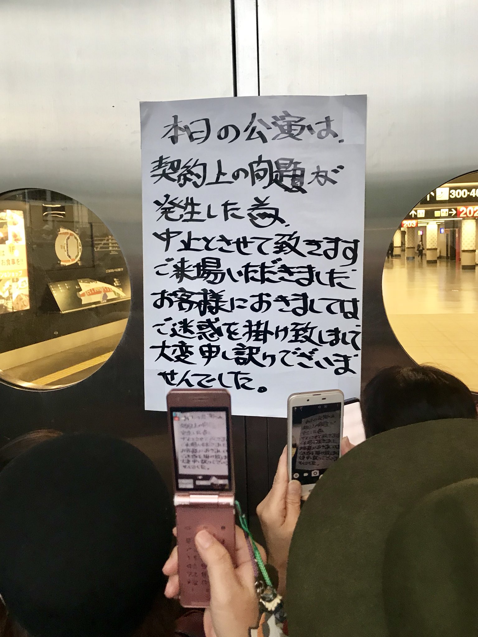 係員が「重要な契約の問題が発覚した為、主催者、所属事務所が協議を重ねた結果、本日の公演は中止とさせていただきます」とアナウンス。