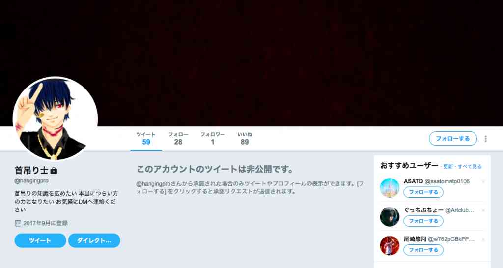 https://twitter.com/hangingpro白石隆浩容疑者が利用していたとされるTwitterアカウントの名前は「首吊り士」だったそうです。捜査関係者によると、この首吊り士というツイッターアカウントは白石隆浩容疑者が自殺志願者と連絡を取る際に使われていたとの事。