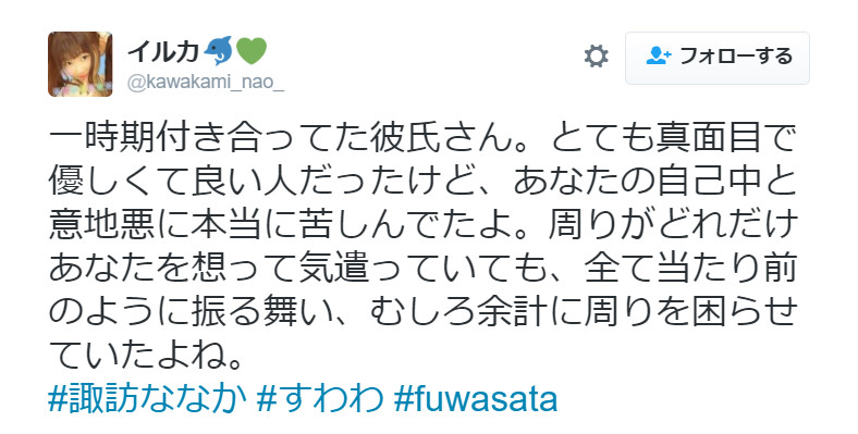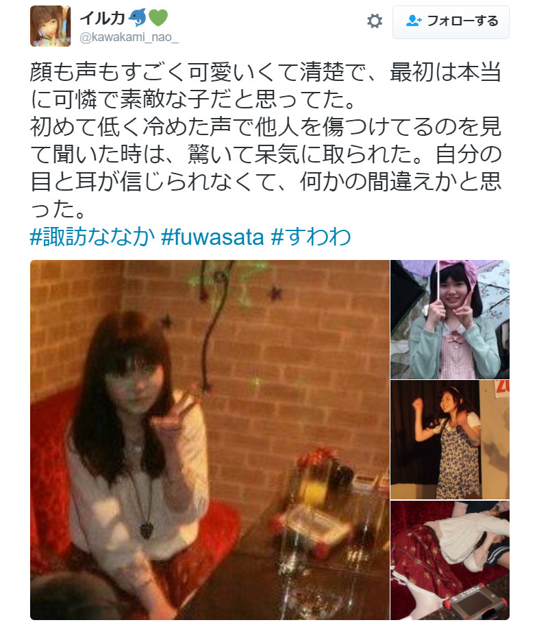 諏訪ななかさんについて調べてみると、「炎上」というワードが出てきます。 その炎上について調べてみると、どうやらTwitterの裏垢が関係しているようです。 その裏垢は諏訪ななかさん本人のものではありませんが、掲載されている内容や画像から高校の同級生が投稿していたと言われています。 現在そのアカウントは消されてしまいましたが、画像が残っていました。