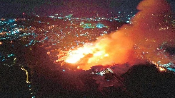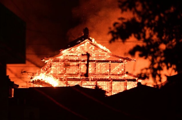 沖縄県の世界文化遺産・首里城で発生中の火災。骨組みが焼け、崩れ落ちています。