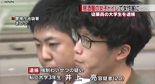 井上亮の大学や顔画像は?逮捕容疑は”強制わいせつ”池袋の居酒屋八兵衛のトイレにてアルバイト中に…twitter上に井上容疑者を良く知る人物も現れる