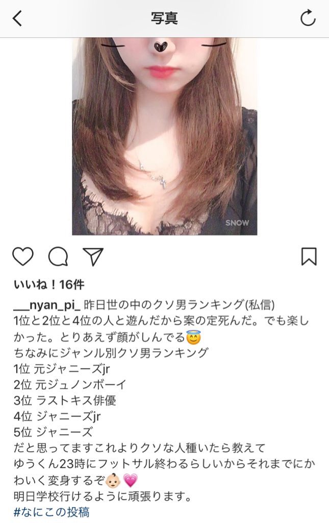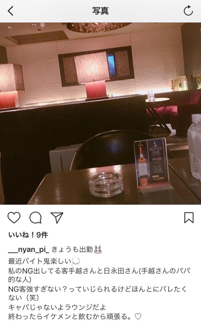 手越裕也のセフレで有名な「こなつ」さんのインスタの裏垢です。彼女はラウンジで働いていて、ラウンジで働いているのをバレたくない為に手越はNGにしているそうです。