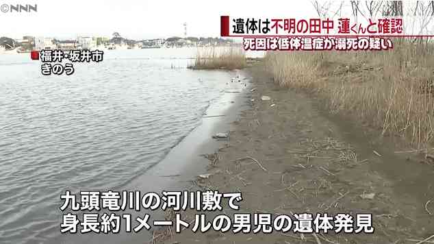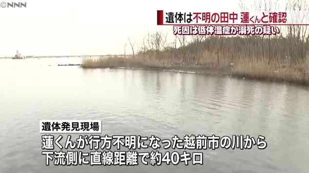 19日、坂井市三国町を流れる九頭竜川の河川敷で身長1メートルほどの男児の遺体があおむけの状態で見つかった。警察が身元の確認を進めていたがDNA鑑定の結果、先月9日から行方不明になっている越前市の会社員・田中了士さんの長男・蓮くんと判明した。