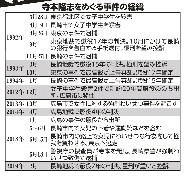 自宅での殺害を知らない妻子を連れ、寺本は東京を離れる。実家のある長崎市に逃亡し、そこでたまたま見かけた当時12歳の女子中学生を尾行。