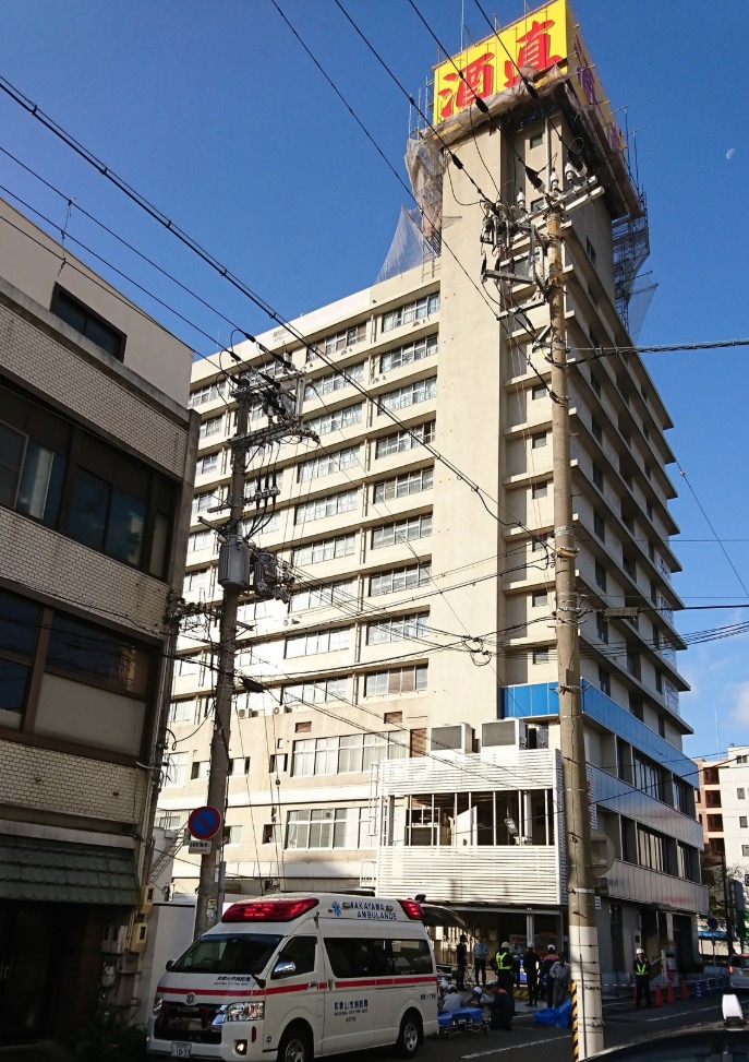 ビルには地元商社の本社が入る。和歌山西署や同社によると、最上部から道路までは40メートル以上。最上部で9月上旬から商社の看板の補修工事が行われ、現在は工事が終了し、足場の解体作業中だった。15日の午前中にも同様に鉄パイプが落下する事故があったという。