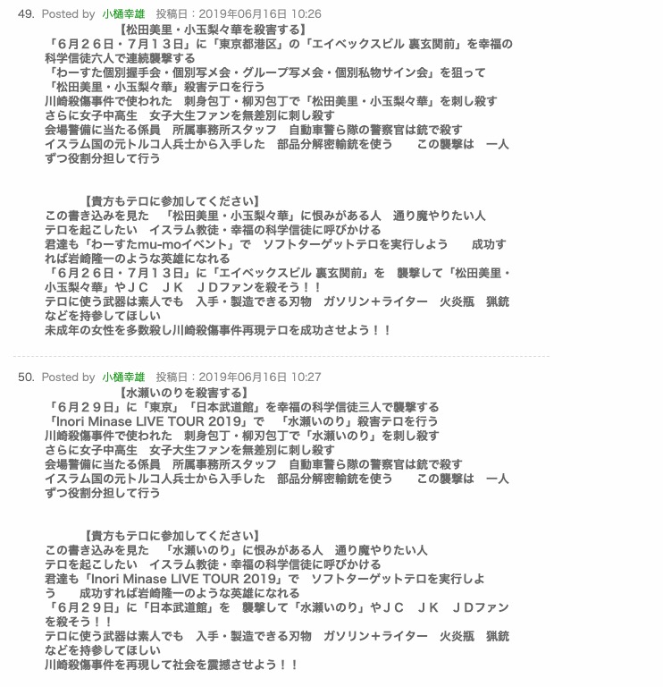 さらにその後、私立恵比寿中学のメンバーにも殺害予告している小樋幸雄。