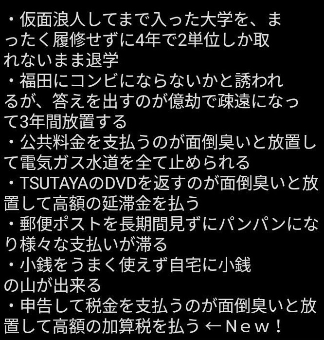 徳井は延滞料金1年分とか電気水道止められるのは当たり前くらいの先延ばし癖があるから、謹慎期間中にADHDであるか診察を受けるべきだな pic.twitter.com/AcltNQ7Kve