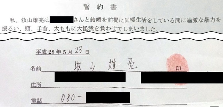 〈私、牧山雄亮(※友井の本名)はA子さんと結婚を前提に同棲生活をしている間に過激な暴力を振るい、頭、手首、太ももに大怪我を負わせてしまいました。(中略)度重なる浮気をし、あげく暴言を吐き(中略)ご両親と結婚するまでは子供を作らないと約束もしたのに、A子さんを妊娠させ、流産させてしまい、その傷ついた体と心に輪をかけるように「逆によかったやん」といたわる事もせず、ひどい言葉で深く傷つけてしまいました〉