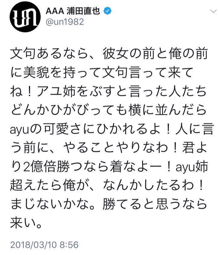 浦田さんの酒癖の悪さはファンの間では有名ですよね。#AAA #浦田直也 #浜崎あゆみ pic.twitter.com/lnrf80svgF