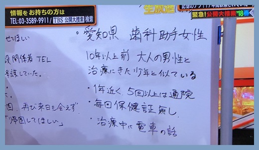twitter.com1月31日に放送されたTBSの番組「緊急!公開大捜索’18春」には、歯科助手をしているという女性から以下のような情報が寄せられました。