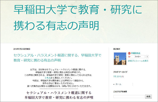 声明は7月23日に「早稲田大学で教育・研究に携わる有志」がブログで発表した。