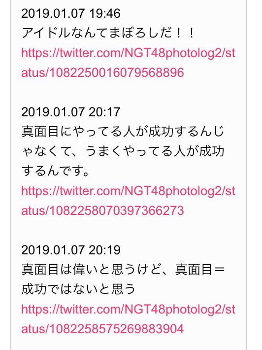 こんなこと言いたくない。お世話になってる人に迷惑かけたくない。皆さんにngtを嫌いになってほしくないからこの1ヶ月つらくても黙ってた。報道でもngtということは伝えないように私がお願いした。それもこのグループが大切だったから。そして全部対処、処分してくれると信じてたから。