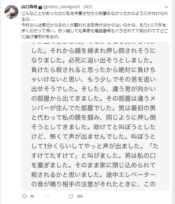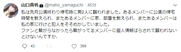 さらに、山口はNGTの他のメンバーが、2人の男性に関わっていることも訴えた(すでに当該ツイートは削除されている)。