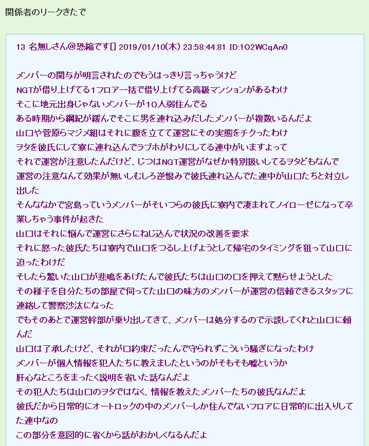 ネット上では『関係者のリーク』として、山口さんが住んでいたマンションはNGT48がグループで借りている1フロアの一室であったこと、そしてそこに彼氏を連れ込んで好き勝手しているメンバーがいた事が流れています。