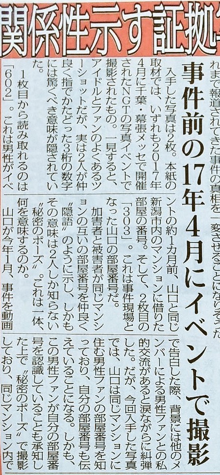 山口が今年1月、事件を動画で告白した際、背景には他のメンバーによる男性ファンとの私的交流があると涙ながらに糾弾した。だが、今回入手した写真では、山口は同じマンションに住む男性ファンの部屋番号を知っており、自分の部屋番号も伝えていたことになる。しかも、この男性ファンが自分の部屋番号を認識していることも承知した上で“秘密のポーズ”で撮影しており、同じマンション内で2人の私的交流があったことをうかがわせる写真だ。