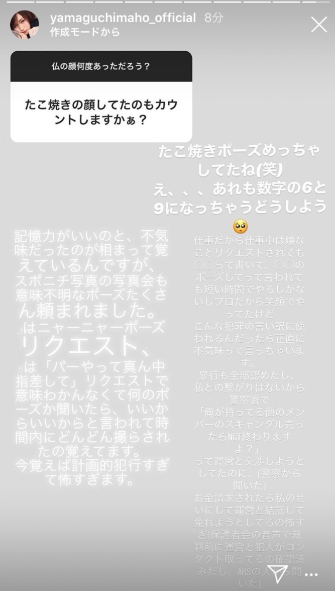 山口真帆は、showroomで最初に事件をぶちまけた時だって別に当該メンバーの名前を言うことは全然できたんだよ。それをしないのは彼女なりの仁義とかそういうものなんだけどね。これ以上彼女に対する攻撃が続くなら、おそらくAKBグループ全体がとどめを刺されることになる。 https://t.co/oVZbbRVkzM