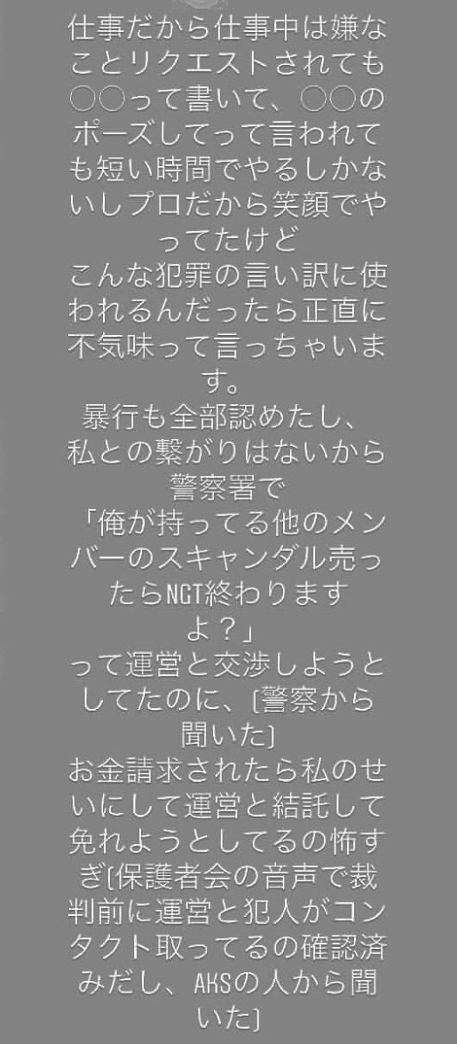 他のメンバーの醜聞を暴行犯が握っていて、それを材料にAKSを脅しているのだとしたら、ここ最近の悪質な報道や特定人物が繰り返し彼女を狙いに名誉毀損を続けている理由もなんとなくわかる。 pic.twitter.com/afNrIGsSmL