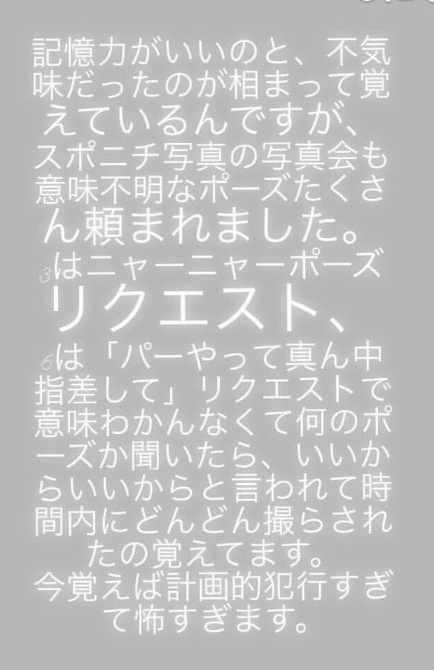 スポニチさんが名誉毀損すぎるのでもう関わりたくないけど言わせてもらいます。ファンの方はご存知の通りイベント写真会はリクエストされたポーズをします。それをカメラ目線でやるので相手が何のポーズしているかもほぼ分かりません。AKB新聞やってて写真会の仕組みも分かっているはずなのに酷すぎる https://t.co/kQjufb7hsT