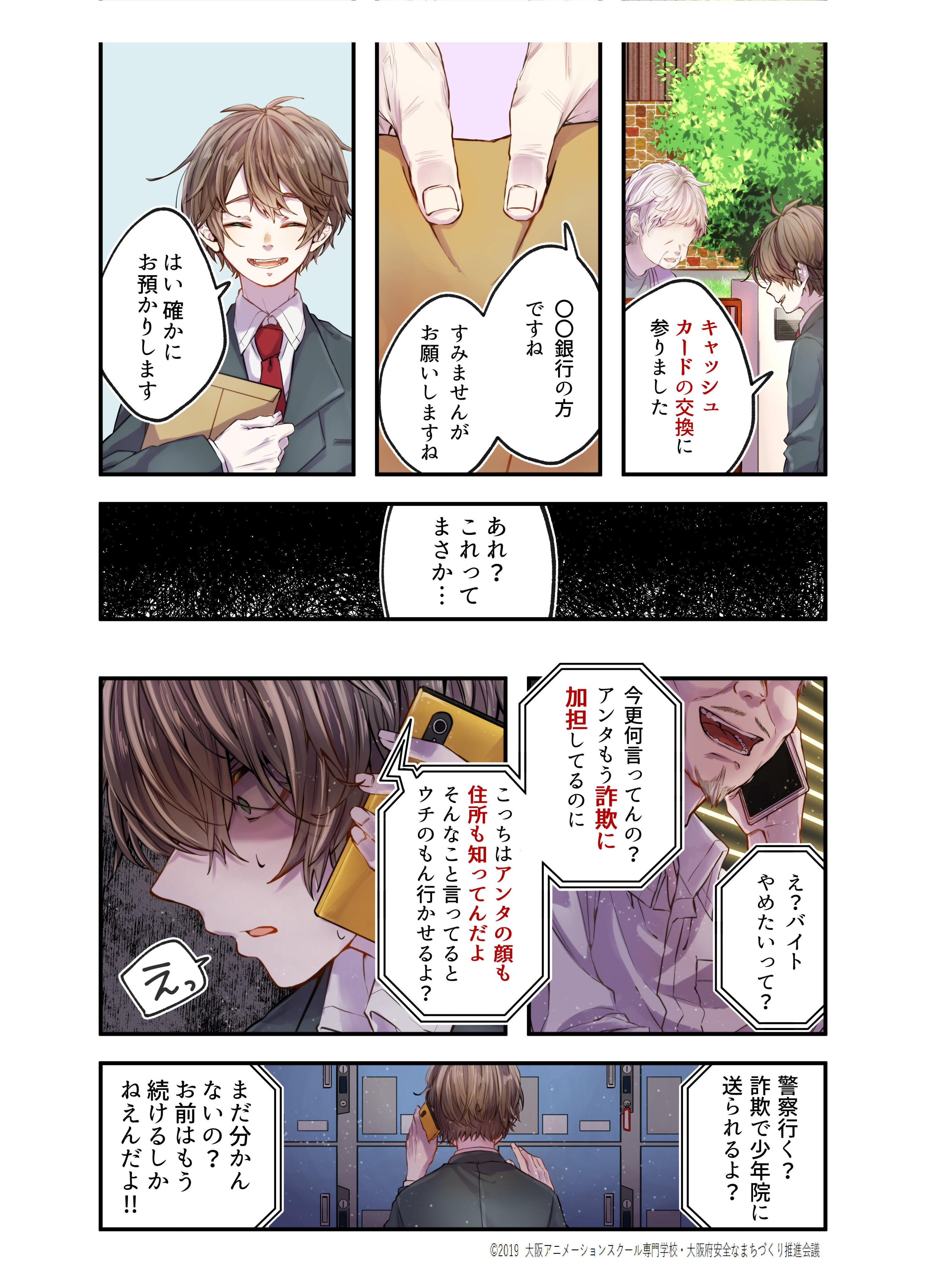 大阪アニメーションスクール専門学校様の協力により、特殊詐欺の受け子に応募したらどうなるのかをマンガで作成しました! #受け子 #裏バイト #闇バイト を検索中のあなた!これを読んでエンディングを考えて! #マルチバッドエンディング #安全・安心なまちづくりの日 #全国地域安全運動 pic.twitter.com/oliqJVngyF