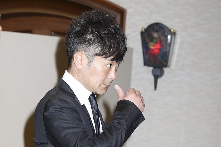 7日に写真週刊誌『FRIDAY』で雨上がりの宮迫博之、ロンドンブーツ1号2号の田村亮らとともに詐欺グループの忘年会に参加したことが報じられて以降、初の公の場となったが、報道陣の声かけにも笑顔のまま、無言を貫いた。