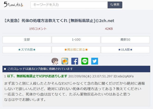 2ちゃんねるにその後「死体の処理方法教えてくれ」というスレが立てられる
