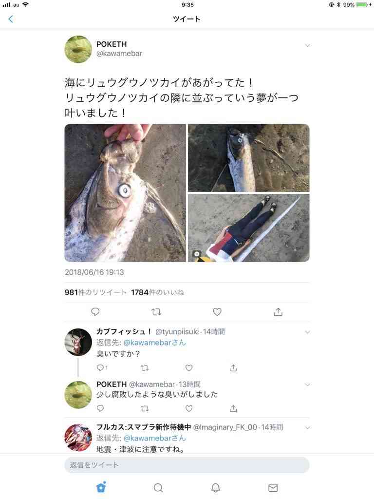 昨日のツイートで本来は陸から離れてる深海に生息するリュウグウノツカイが打ち上げられたりしてる報告めっちゃあってゾワゾワしてる。