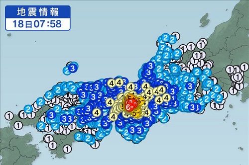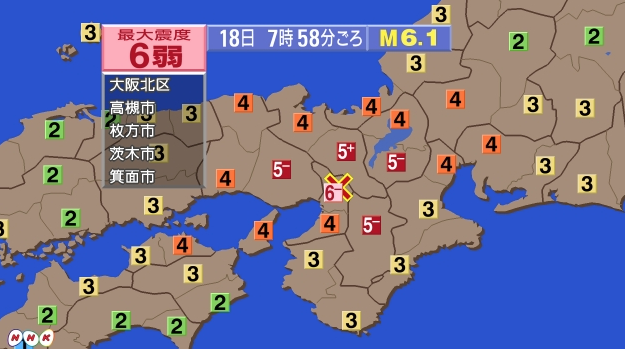 http://jin115.com/archives/52223769.html18日朝、大阪府北部を震源とするマグニチュード6.1の地震があり、大阪・高槻市などで震度6弱の揺れを観測したほか、近畿地方の広い範囲で震度5強や5弱の揺れを観測しました。